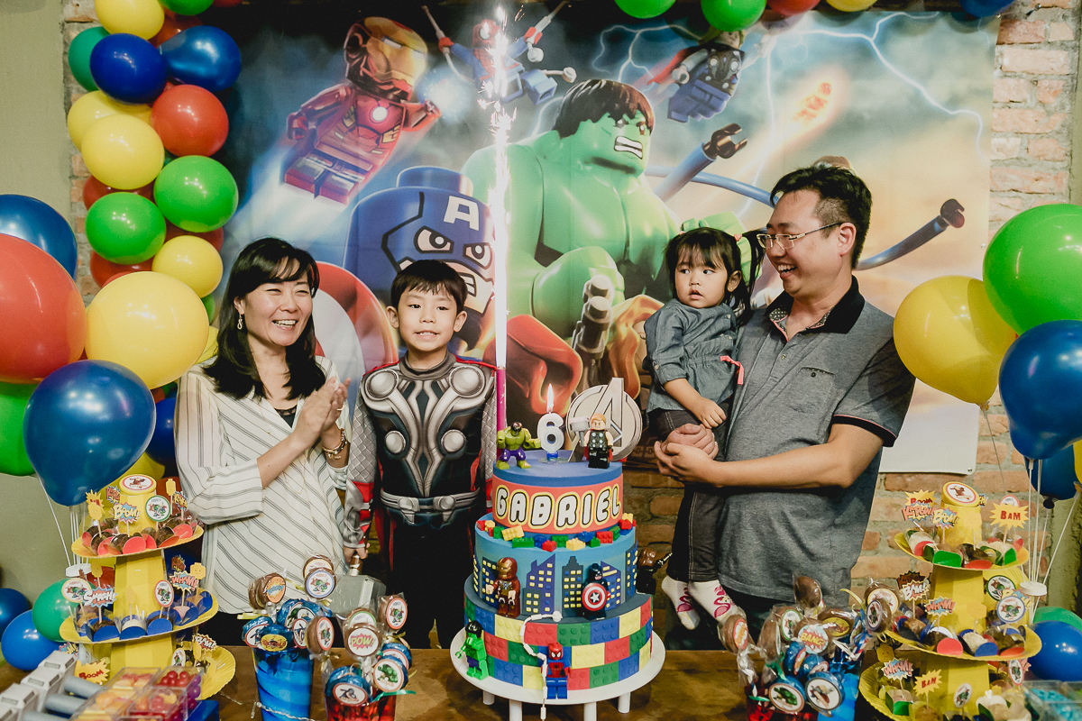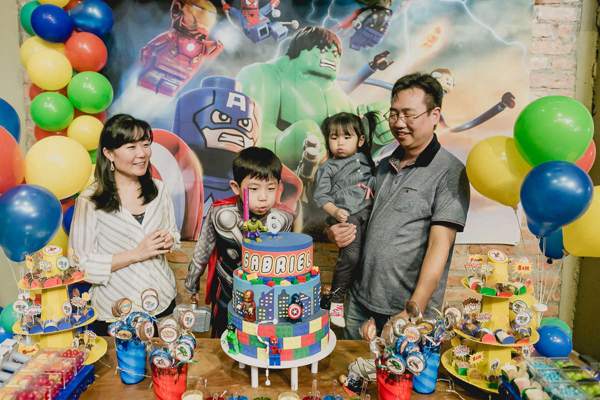 pais montando a mesa de aniversario com o tema vingadores