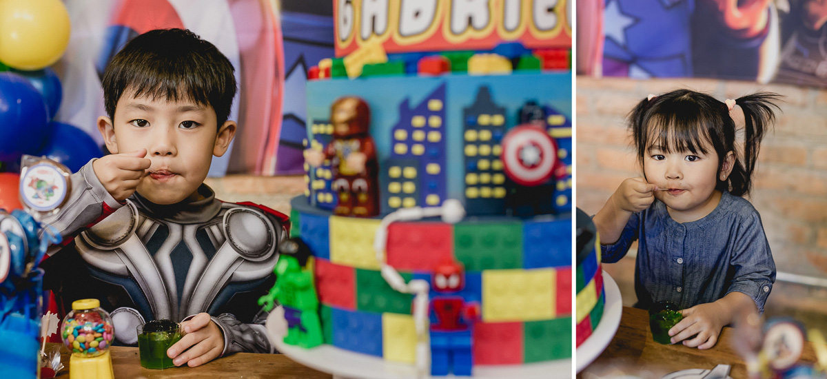 olhando a mesa do bolo pronta com o tema vingadores